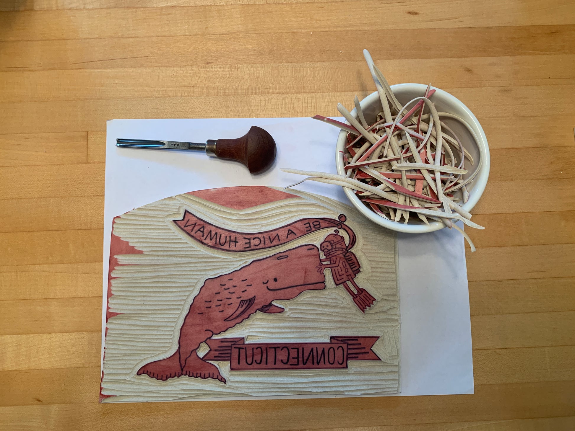 This is an 4.25 x 6” postcard of my original linoleum carving that I then colored digitally.