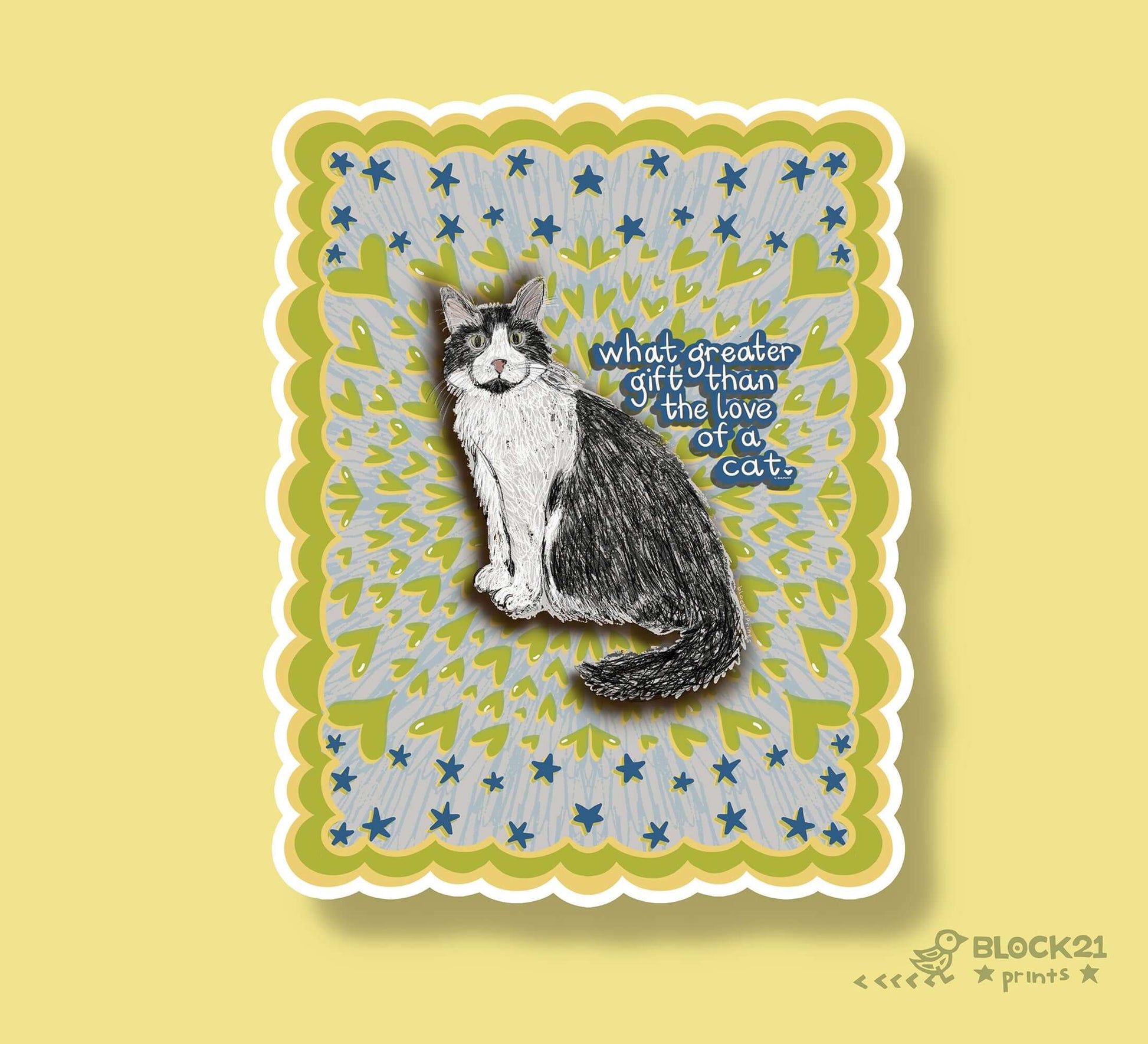 Celebrate the special bond between cats and their humans with this illustrated sticker featuring the quote, “What greater gift than the love of a cat.”