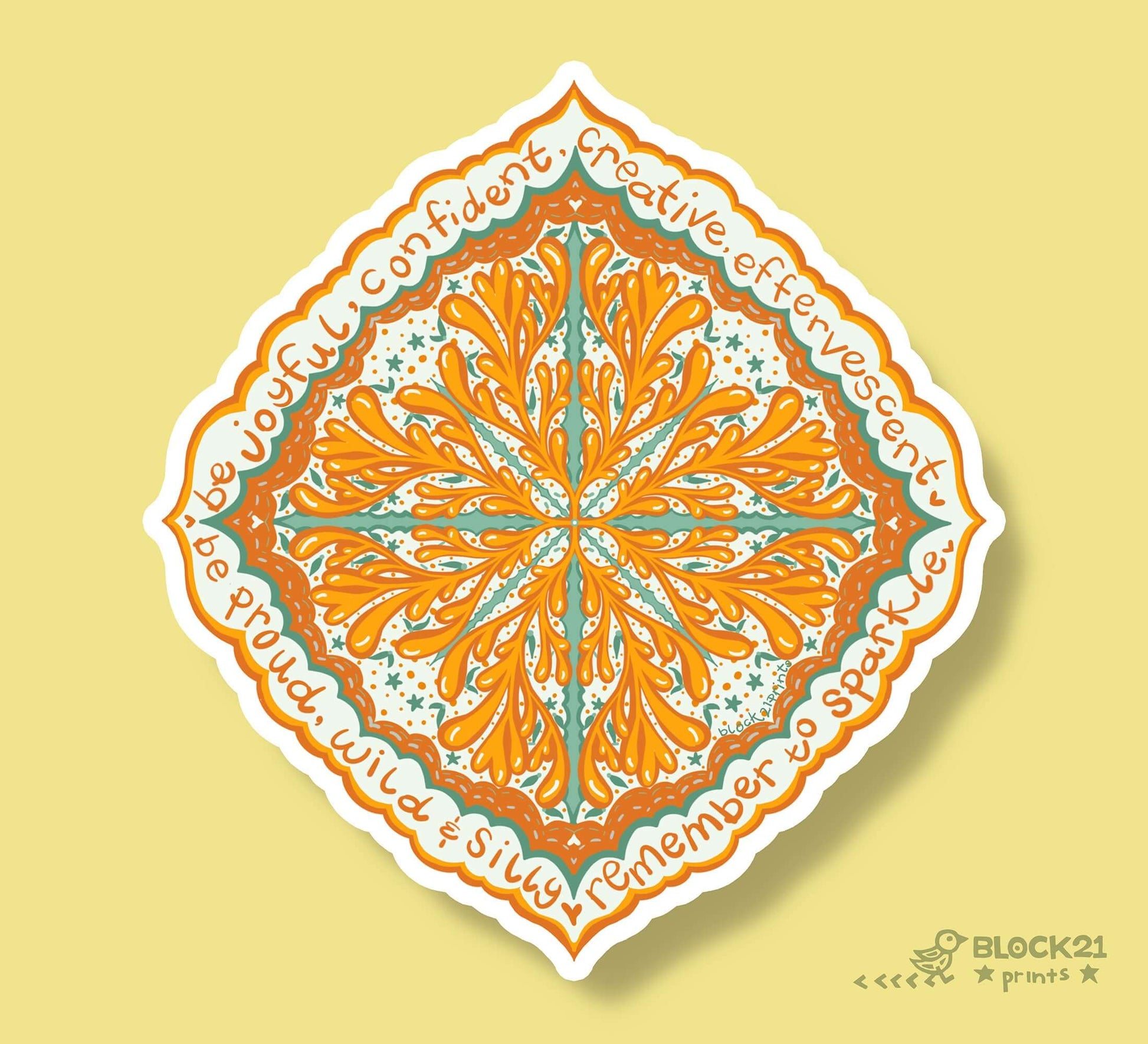Bright, bold, and uplifting, this orange and teal radial sticker bursts with empowering words of encouragement.