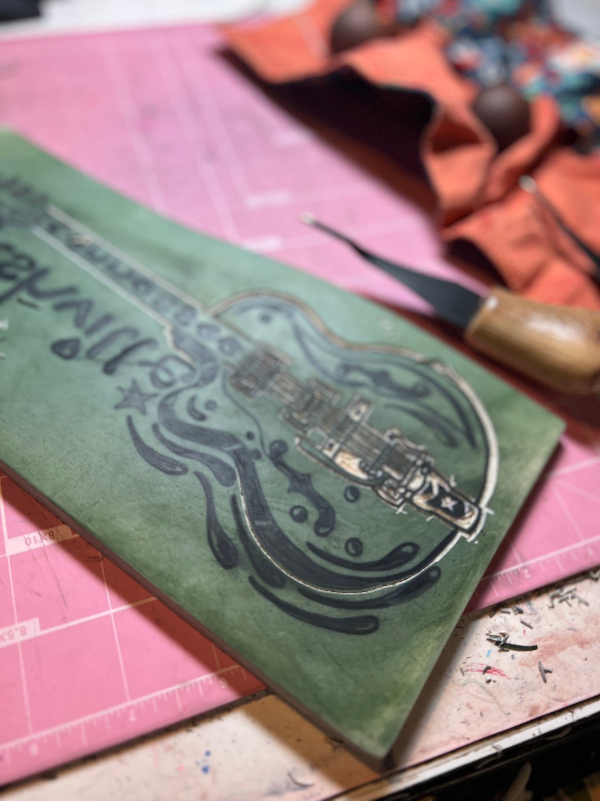 This image is an original linocut of a hollow bodied guitar I created and then colored digitally.