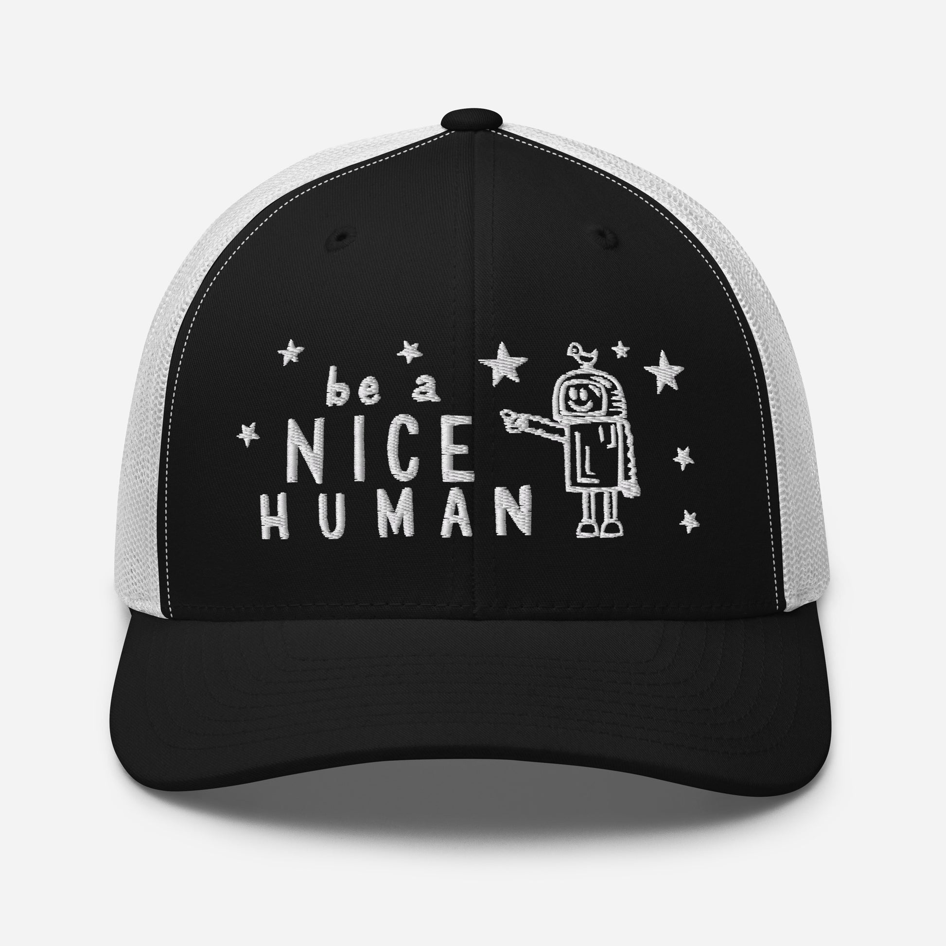 Meet your new favorite accessory! This trucker hat, featuring a Happy Spaceman promoting his mantra to "Be A Nice Human."